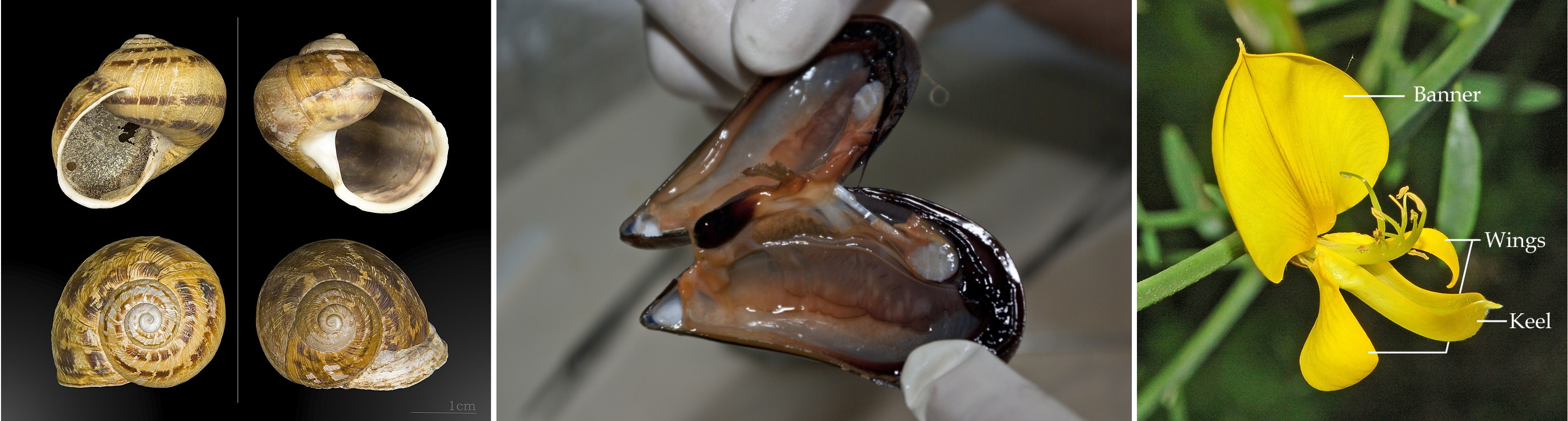 Left to right : Helix aspera, (c) MHNT (CC BY-SA) ; Mytilus galloprovincialis, (c) stefano Merli (CC BY-NC-SA) ; Spartium junceum, Fabaceae, modified from (c) Hectonichus (CC BY-SA)